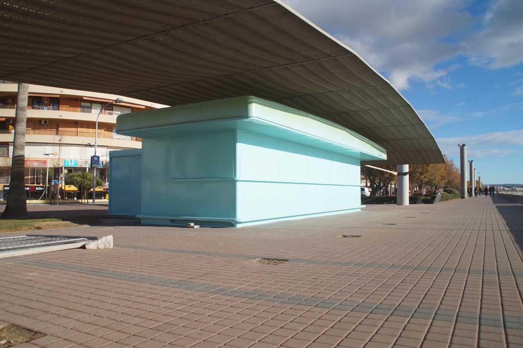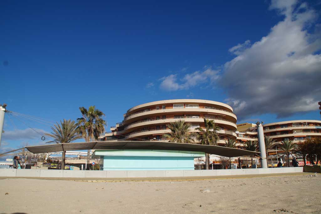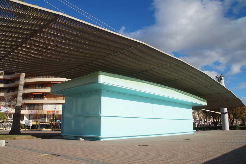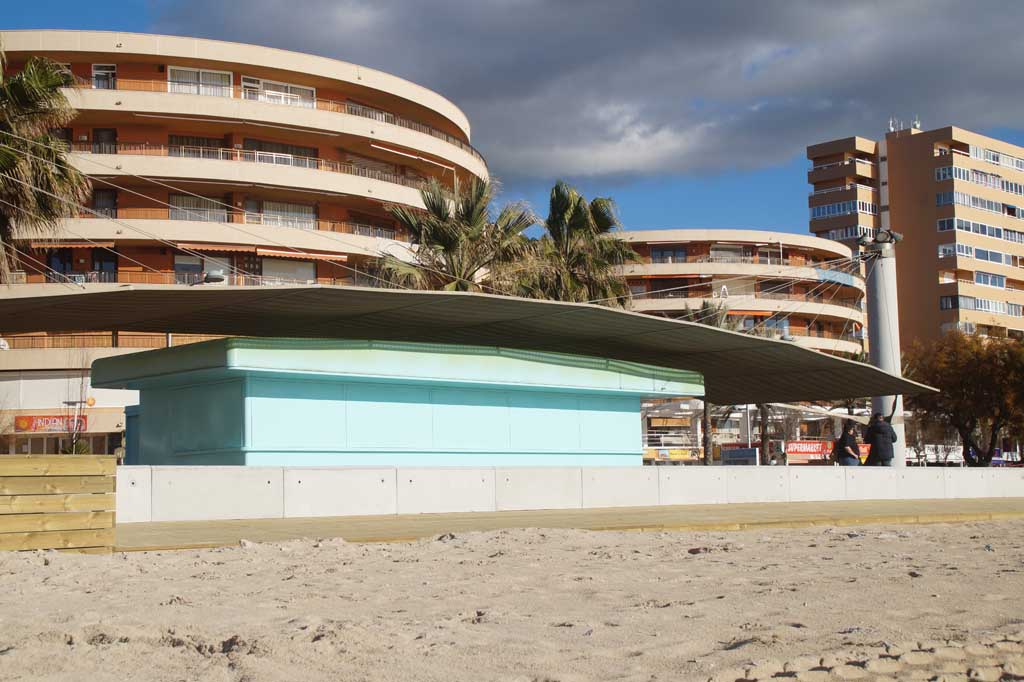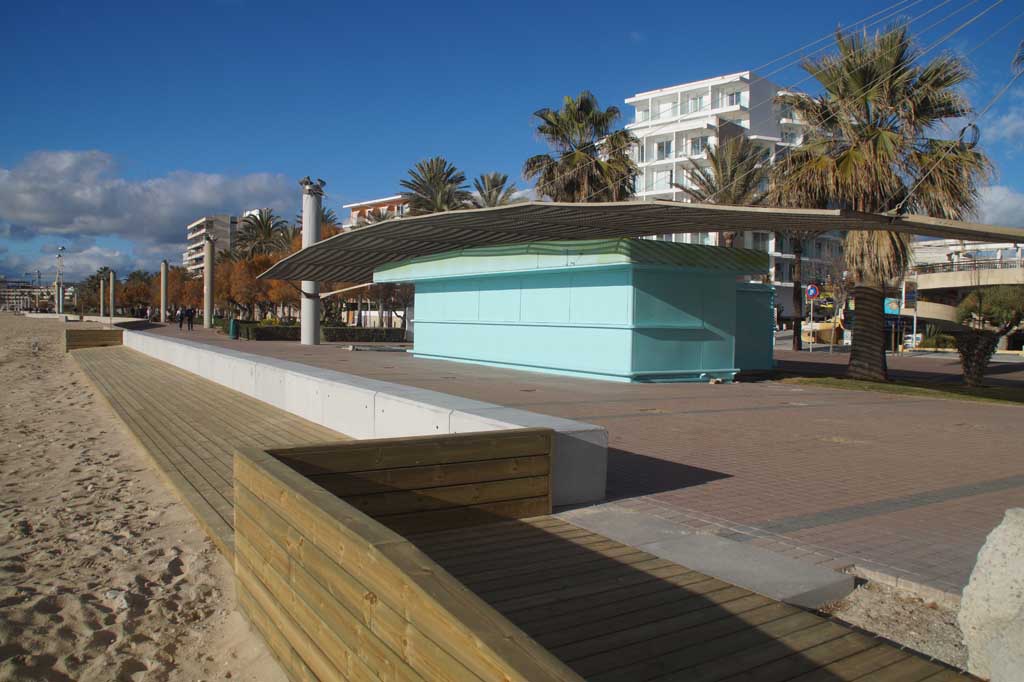 Die bereits fertige Terrasse am Ballermann 12 inklusive der behindertengerechten Eingänge und dem türkisfarbenen Kiosk, macht einen sehr schicken Eindruck. Den Mallorca Urlaubern an diesem Strandabschnitt werden zum Sommer dann auch die Luxusschirme und Luxusliegen geboten. Daneben werden die Getränke und Snacks dann auch direkt von einem Kellner an den Strand der Playa de Palma serviert.