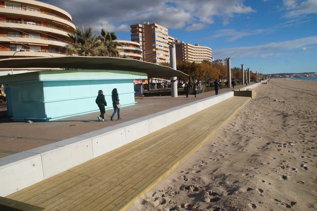 Wie es künftig am Strand vor dem Ballermann 6 auf Mallorca aussehen wird, kann man schon heute am halbfertigen Ballermann 12 bestaunen. Der Bauleiter bestätigte, dass der Ballermann 6 exakt die neue Holzterrasse vom Ballermann 12 verpasst bekommt. Obwohl am Ballermann 12 auch eine Mauer zu sehen ist, sind die Teile mobil und werden zum Sommer entfernt. Aktuell dienen mobile Mauern auch schon am Ballermann 4 und 8 bei Stürmen als Sandschutz.