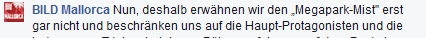Die neue BILD-Mallorca antwortet darauf folgendes: „Nun, deshalb erwähnen wir den „Megapark-Mist" erst gar nicht und beschränken uns auf die Haupt-Protagonisten…“