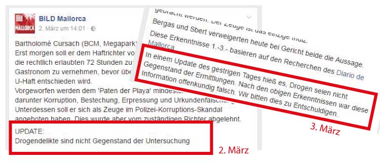 Am 2. März erschien auf der facebook Seite des Reporters ein wichtiges „UPDATE“, wonach es bei Cursach auf keinen Fall um Drogen gehen würde. Dies geschah mit dem Hintergrund, dass malleBZ den BCM Vergleich mit „Big Cocaine Mafia“ veröffentlichte. Doch der Bild Reporter schritt sofort zur Tat, griff zum berühmten Telefonbuch, rief im Megapark an, glaubte die Lügen und breitete sofort den Schutzschild über der befreundeten Firma aus. Nach nur ca. 24 Stunden musste der seriöse Reporter aber ganz kleinlaut seine bewusste Falschmeldung zu Gunsten der Grupo Cursach eingestehen, denn bei den Ermittlungen ging es sehr wohl um Drogen.