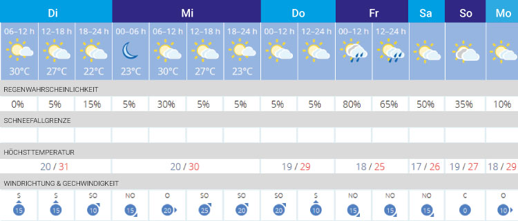 Zum Ende der Woche fallen die Tageshöchstwerte erstmals wieder unter die 30 Grad Marke. Dann steigt auch das Regenrisiko am Ballermann und es könnten sich Hitzegewitter entladen.