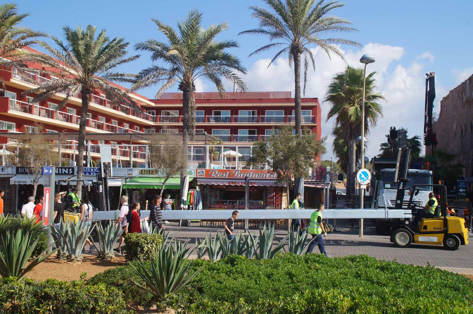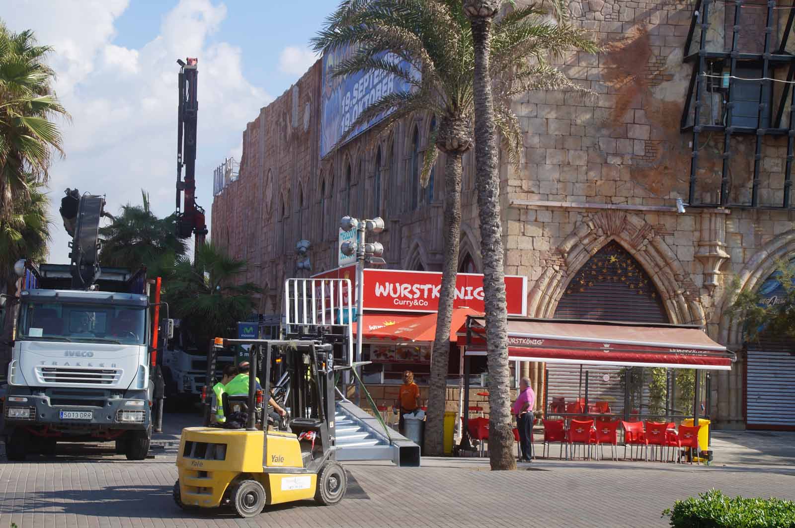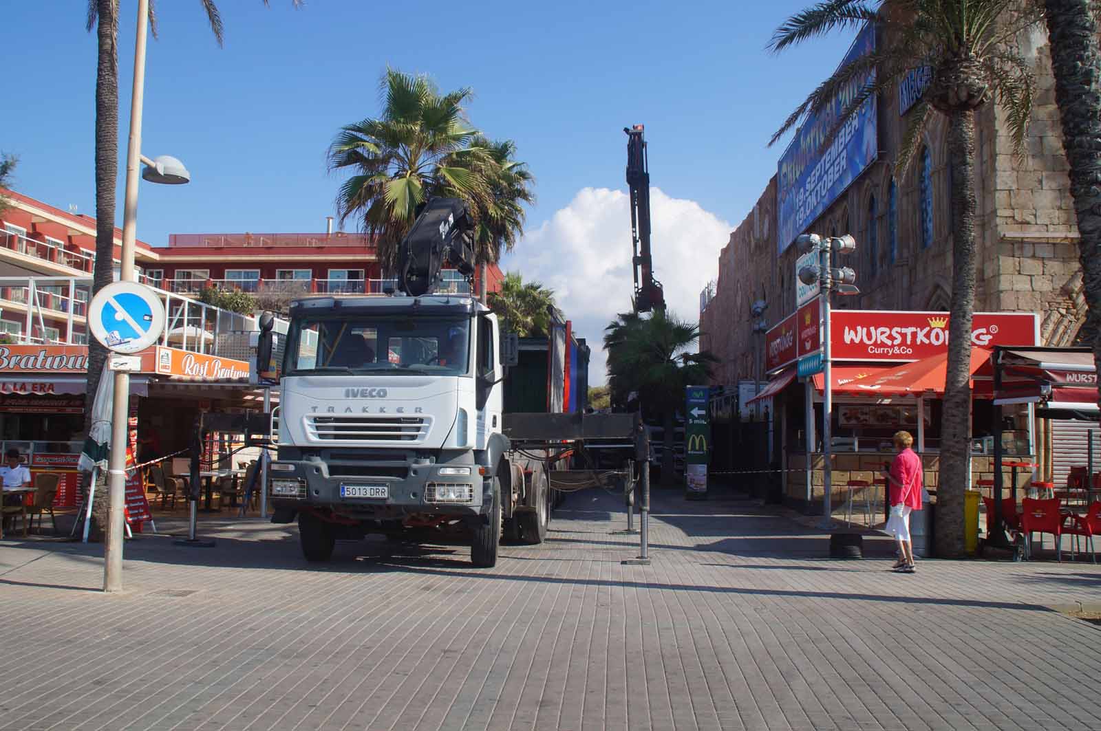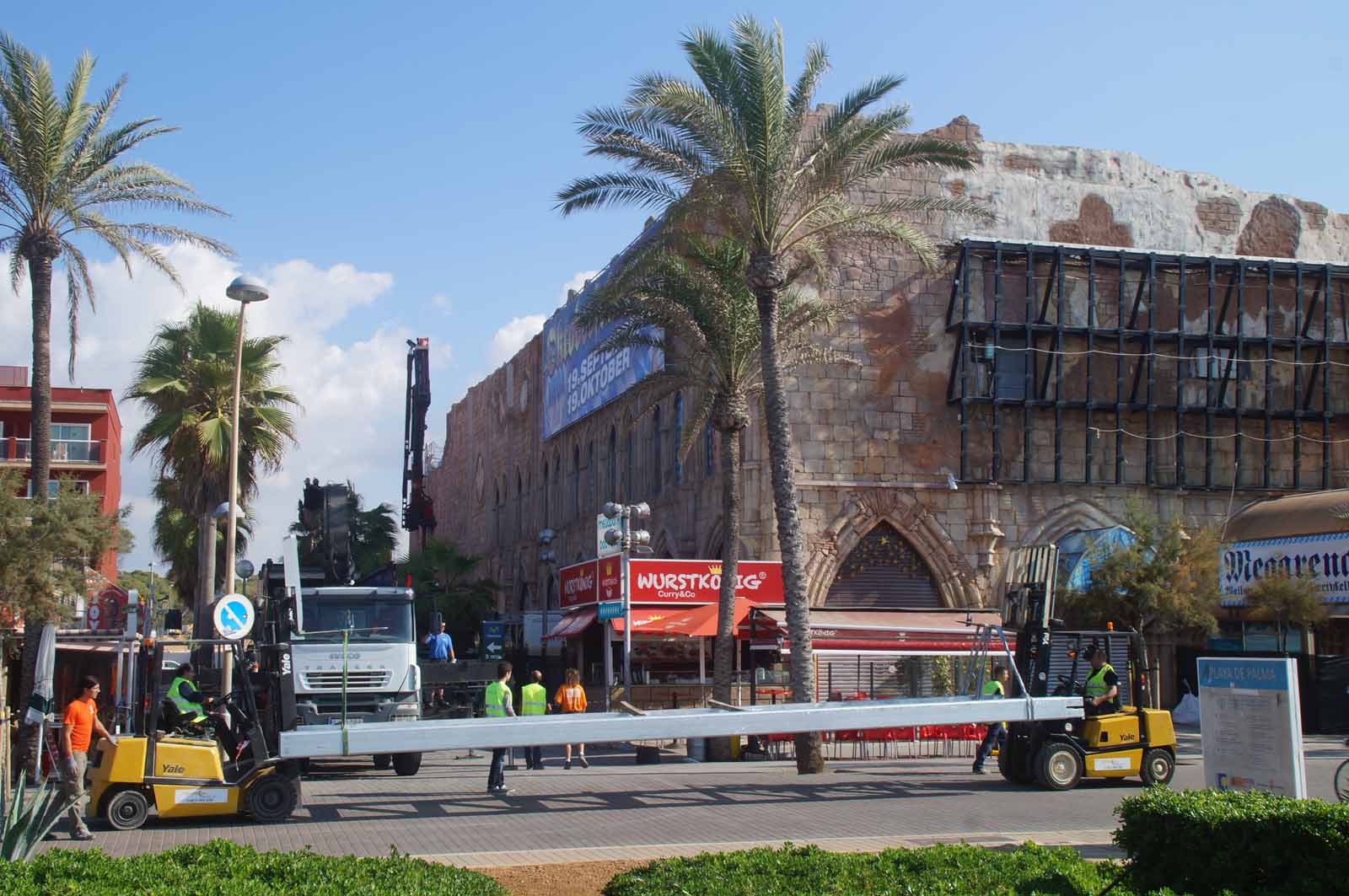 Die Arbeiter tragen weder Helme noch Sicherheitsbekleidung. Sämtliche Arbeiter sind Angestellte des Megapark und nicht etwa einer Baufirma. Eine legale Baustelle wäre bei einem solchen "Schwertransport" durch öffentlichen Raum ausgeschildert, abgesperrt und ein Beamter der Polizei wäre aus Sicherheitsgründen anwesend. Wie man gut erkennt passieren Urlauber die Transportwege, ebenfalls Radfahrer. In diesem Winter werden auch die Rolltreppen installiert, die man auf den Bildern am 15.12.2014 schon erkennt.