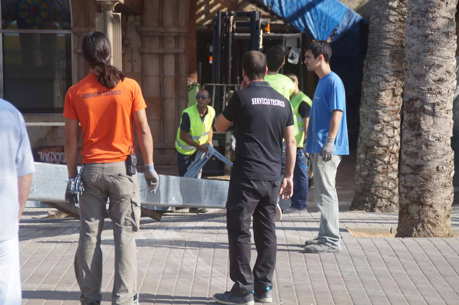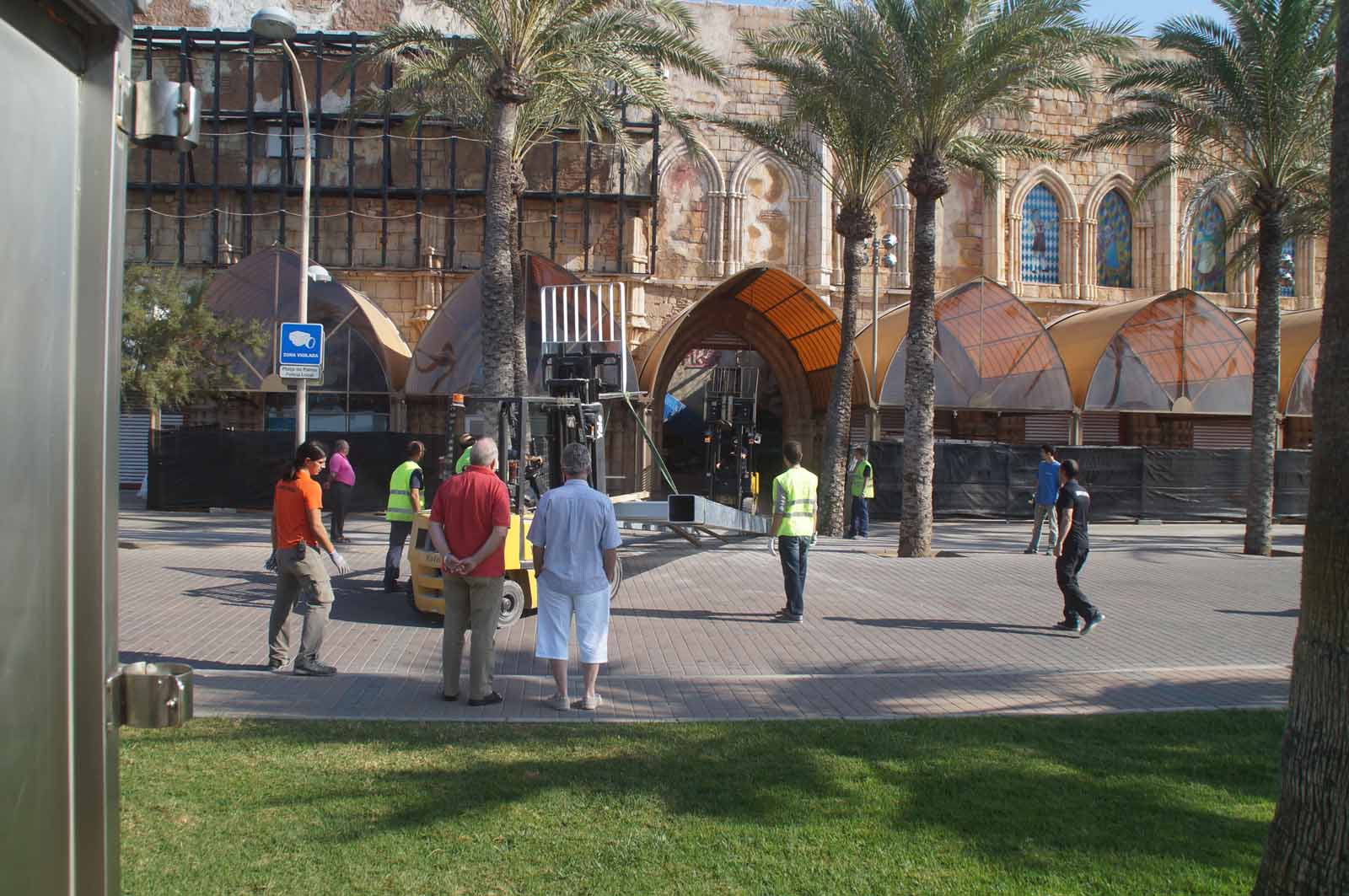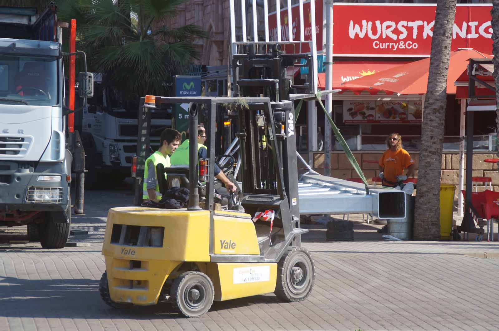 Die Arbeiter tragen weder Helme noch Sicherheitsbekleidung. Sämtliche Arbeiter sind Angestellte des Megapark und nicht etwa einer Baufirma. Eine legale Baustelle wäre bei einem solchen "Schwertransport" durch öffentlichen Raum ausgeschildert, abgesperrt und ein Beamter der Polizei wäre aus Sicherheitsgründen anwesend. Wie man gut erkennt passieren Urlauber die Transportwege, ebenfalls Radfahrer. In diesem Winter werden auch die Rolltreppen installiert, die man auf den Bildern am 15.12.2014 schon erkennt.