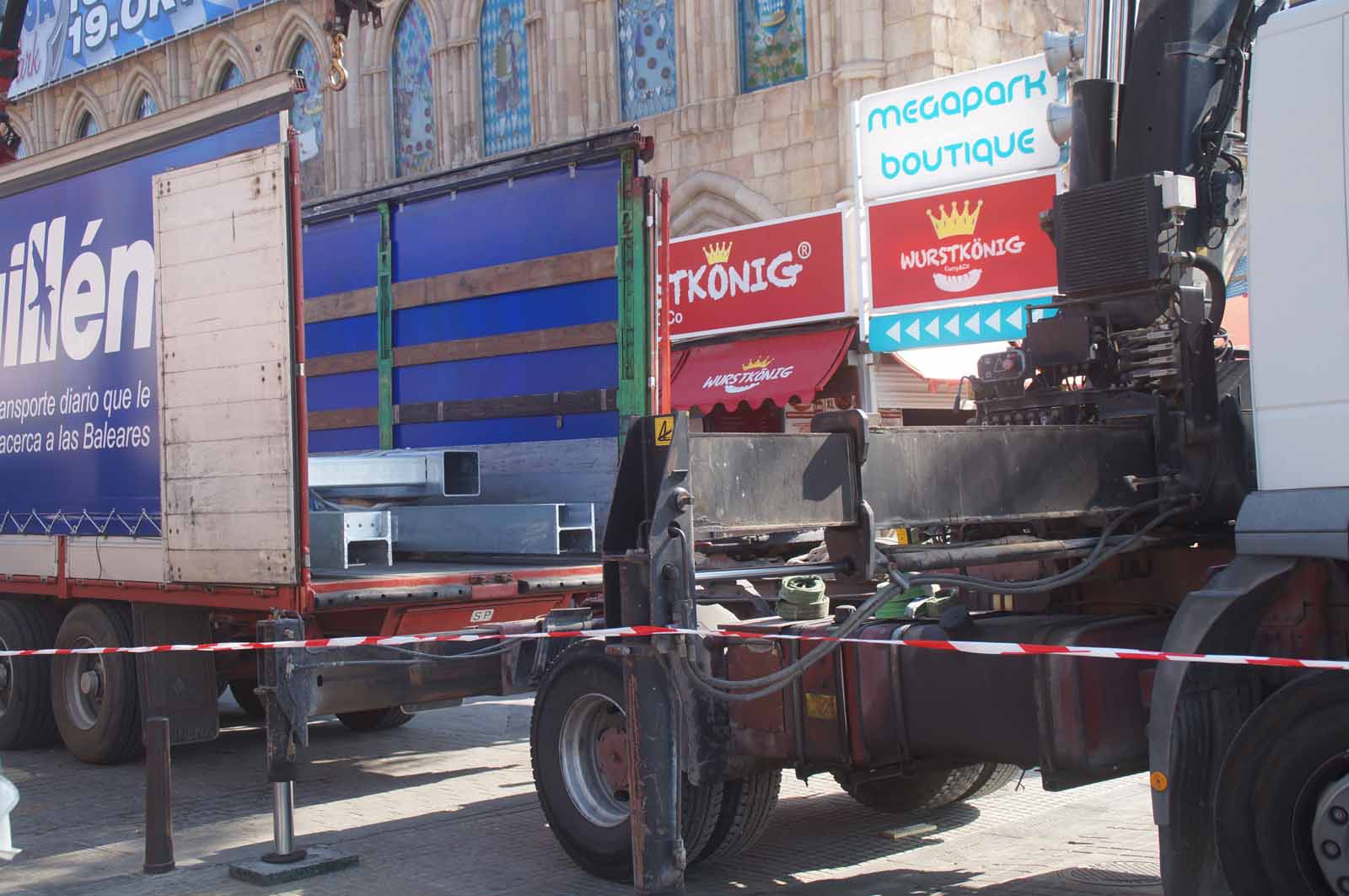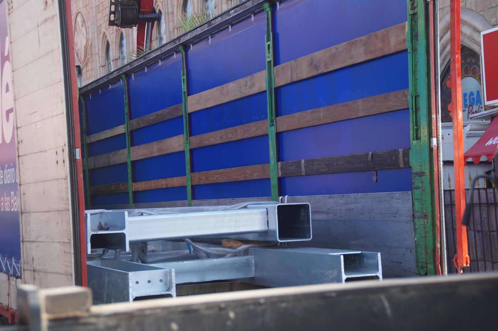 Da man die zahlreichen ca. 15m langen Träger nicht in den Megapark heben konnte, wurde mit 2 Gabelstaplern und 2 Trageseilen losgepfuscht. Bei der Einfahrt in den Megapark löste sich dann einer der tonnenschweren Träger und krachte mit einem lauten Bumms auf den Boden. Leider ist der Zwischenfall nicht auf Video hörbar, sondern nur als Bildserie visuell vorhanden.