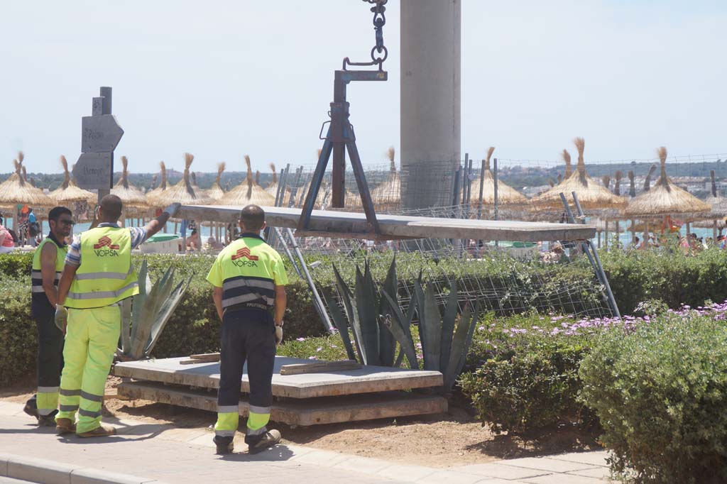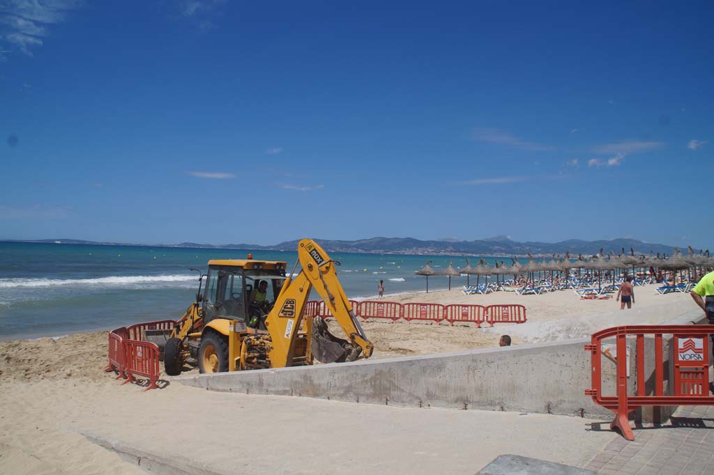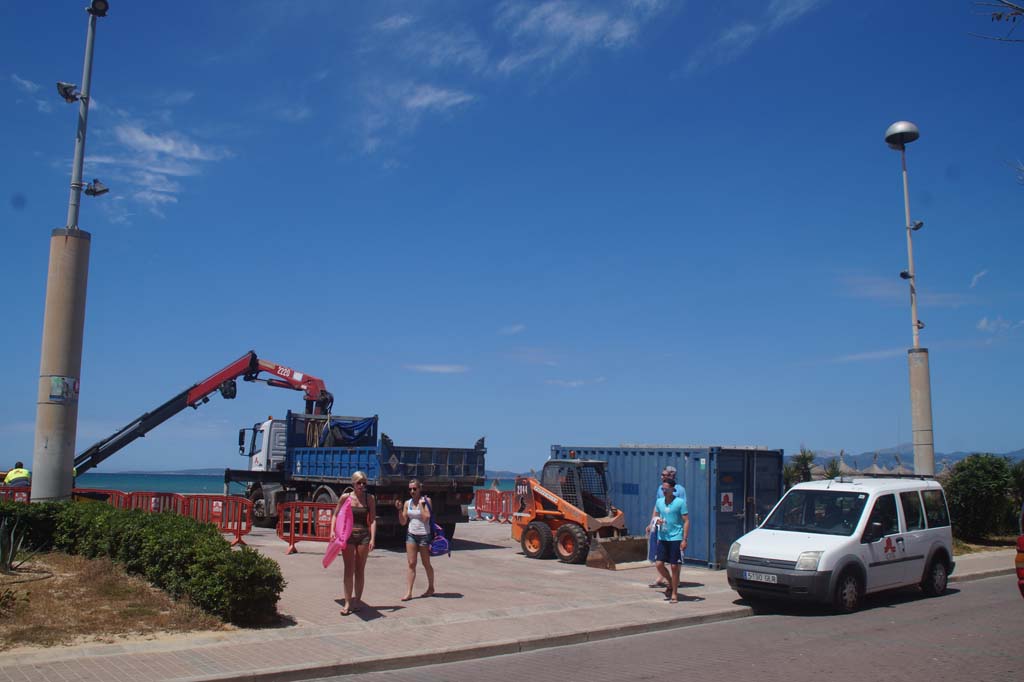 Die maroden Pfosten bröckeln bereits seit letztem Sommer gefährlich. Doch erst mit Beginn der absoluten Hochsaison dröhnt der Kompressor am Ballermann 8. Urlauber, die für eine Strandliege dort 15 Euro bezahlt haben, freuen sich aktuell nicht so wirklich über die lärmenden Aktivitäten.