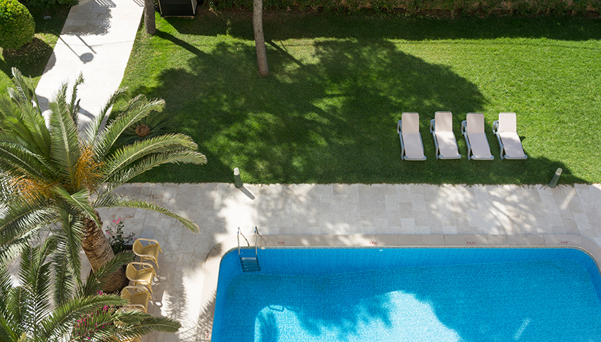 Mallorca Urlauber in den Apartamentos Tres Torres können den großen Pool im begrünten Außenbereich nutzen.